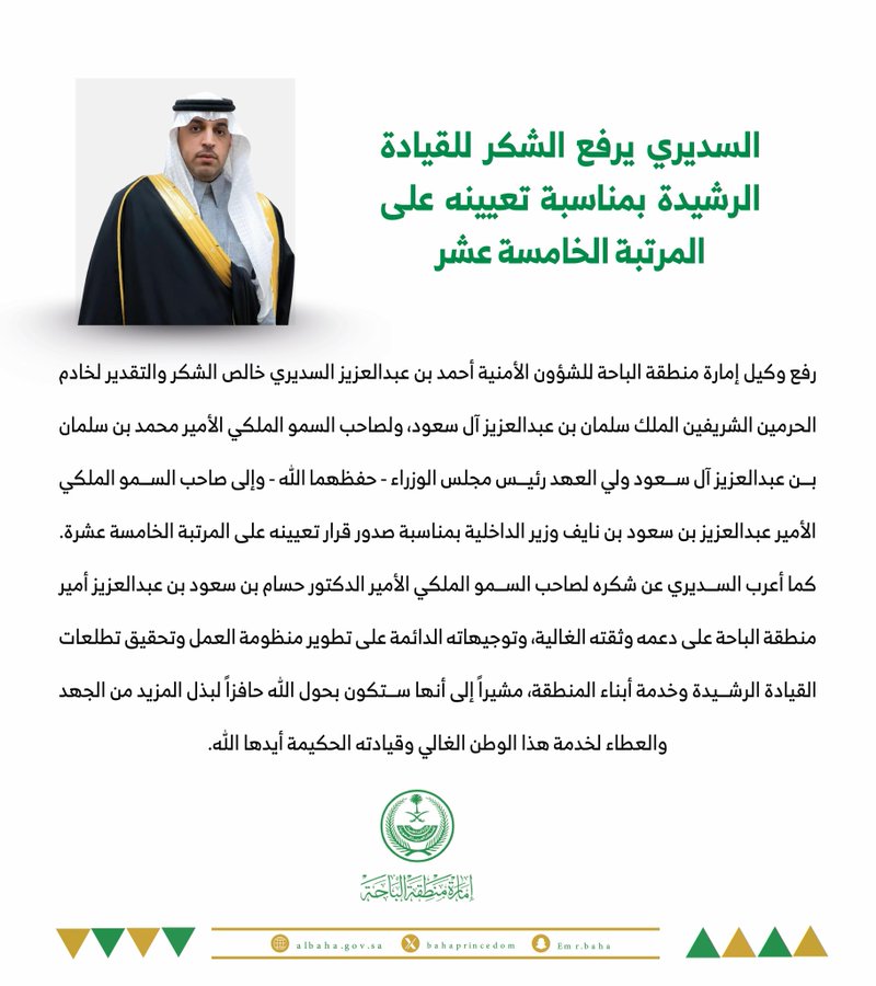 وكيل الإمارة للشؤون الأمنية يرفع الشكر للقيادة الرشيدة بمناسبة تعيينه على المرتبة الخامسة عشر.