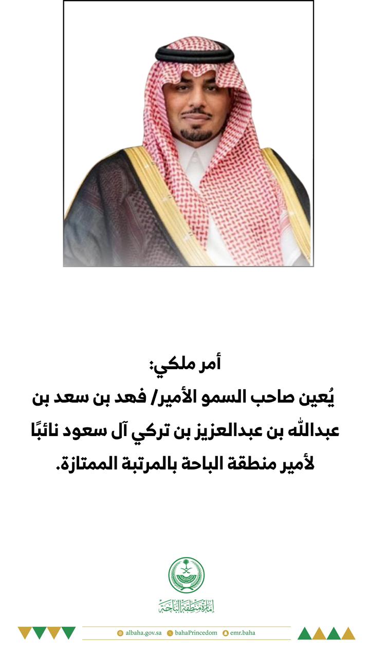 تعيين صاحب السمو الأمير فهد بن سعد بن عبدالله آل سعود نائباً لأمير منطقة الباحة بالمرتبة الممتازة