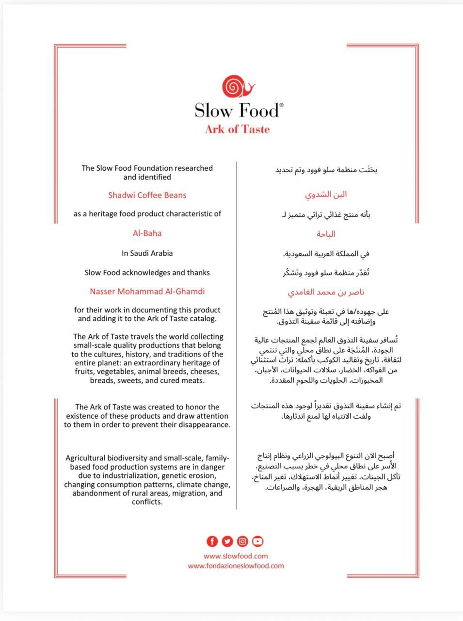 منظمة سلو فوود تشكر الأستاذ ناصر بن محمد الشدوي على جهوده في تعبئة وتوثيق المُنتج التراثي البن وتضيفه إلى قائمة سفينة التذوق السعودية .