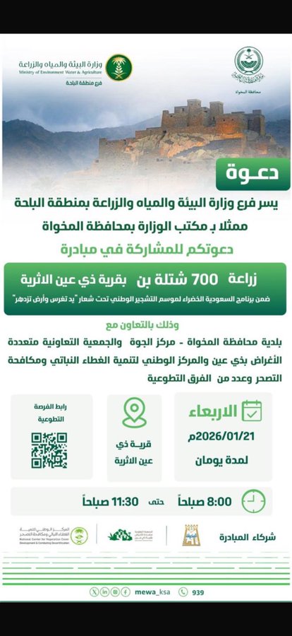 نفذ فرع مكتب وزارة البيئة والمياه والزراعة محافظة #المخواة مبادرة "زراعة 700 شتلة بن بقرية #ذي_عين التراثية وذلك ضمن برنامج #السعودية_الخضراء لموسم التشجير الوطني تحت شعار يد تغرس وأرض تزهر بمشاركة مـن بلدية محافظة المخواة.
