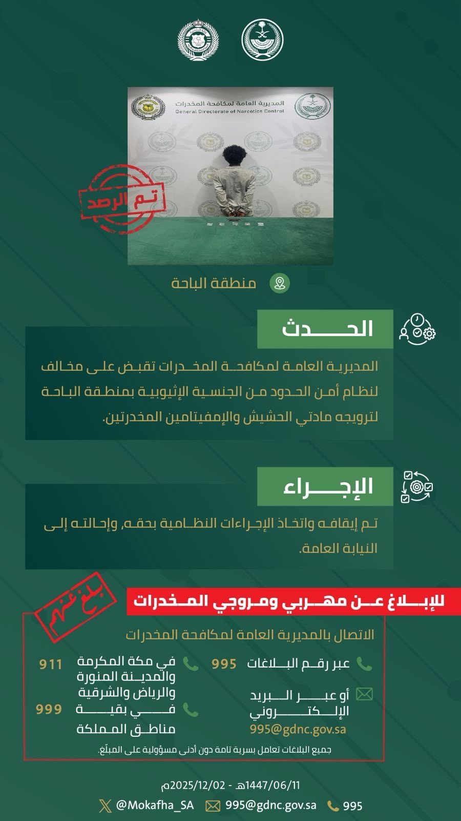 مكافحة المخدرات تقبض على مخالف لنظام أمن الحدود بمنطقة الباحة لترويجه مادتي الحشيش والإمفيتامين المخدرتين.