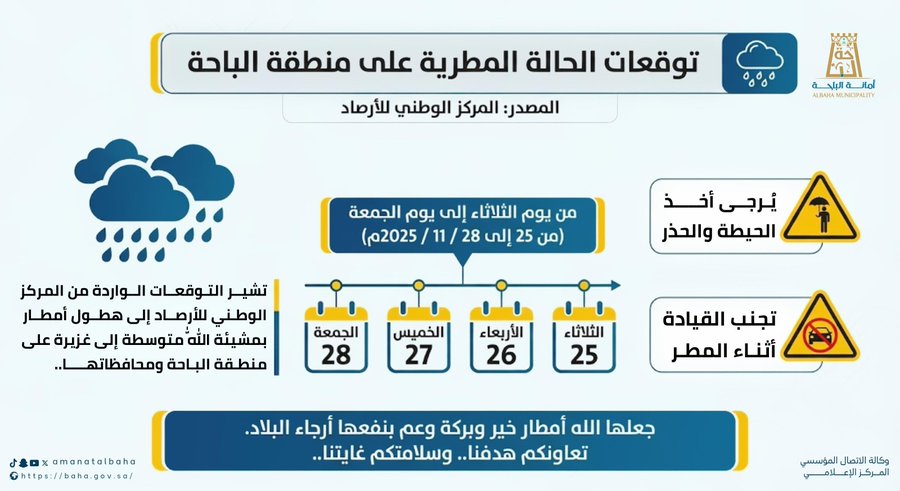 تنبيه جوي بأخذ الحيطة والحذر نتيجة هطول الأمطار على منطقة الباحة